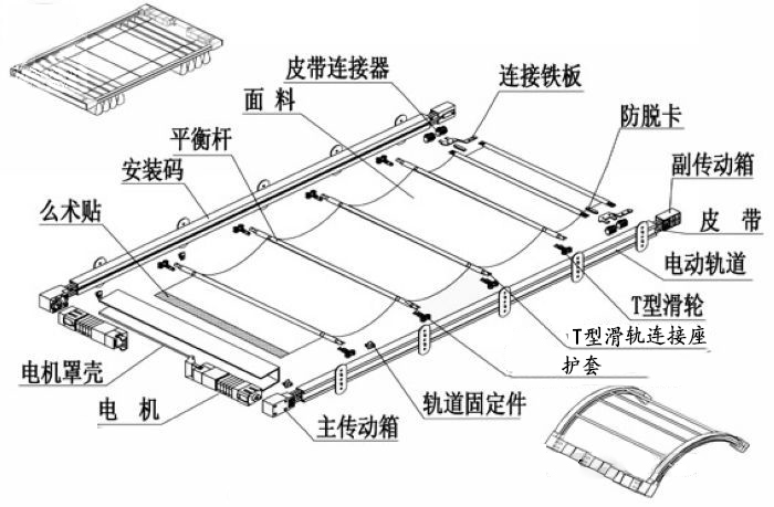 天棚簾每組由左右兩根導(dǎo)軌組成,使用一對同步電機(jī)驅(qū)動。當(dāng)電機(jī)啟動時帶動履帶,中間由彈性引布桿牽引面料從而達(dá)到遮陽的目的。